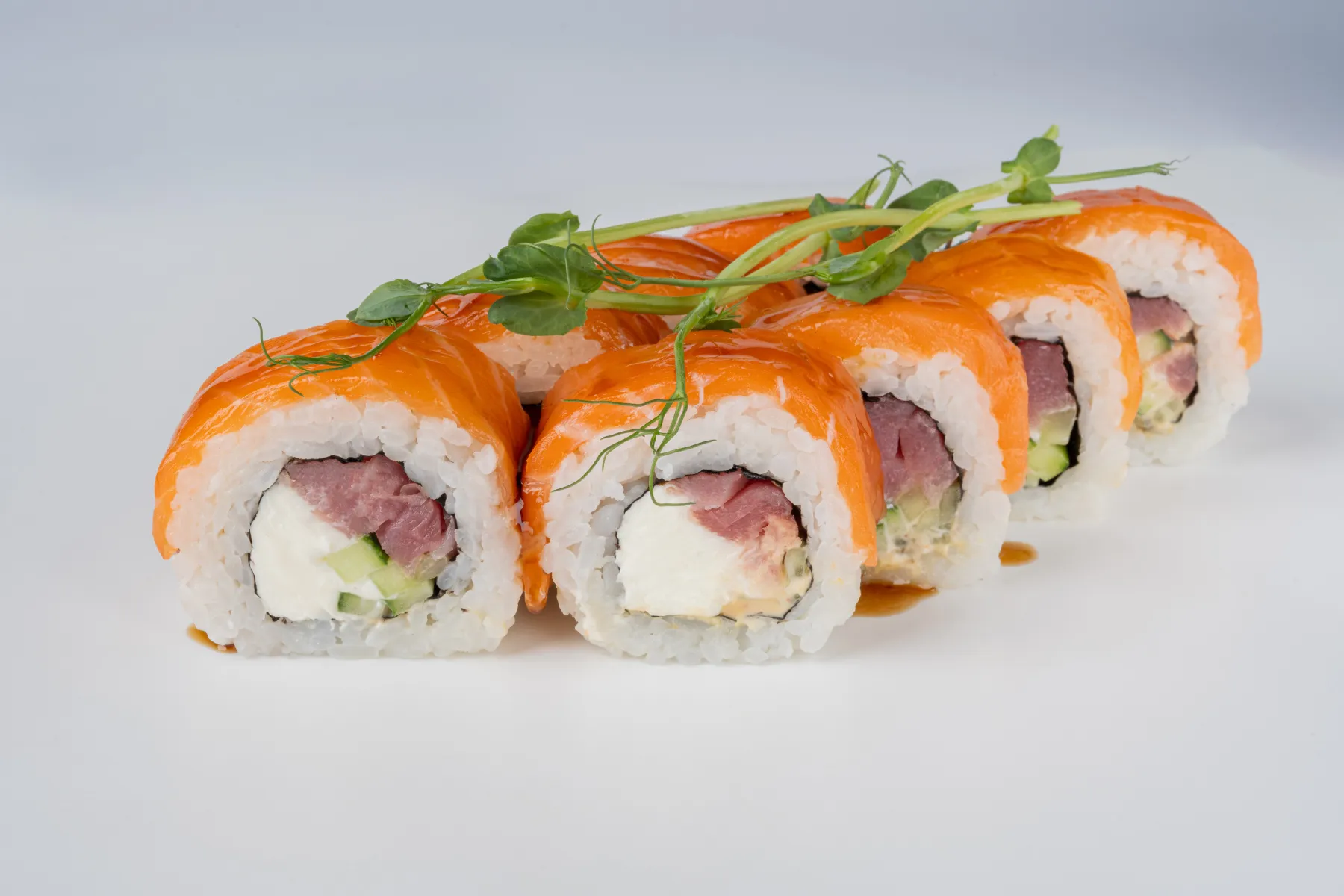 Суші рис, нори, вершковий сир, соус тай-майонез, огірок, лосось, соус унагі, соус манго, тунець, мікрогрін гороху. Комплект: імбир маринований, васабі, соєвий соус (15/5/30 г) по необхідності 8 шт