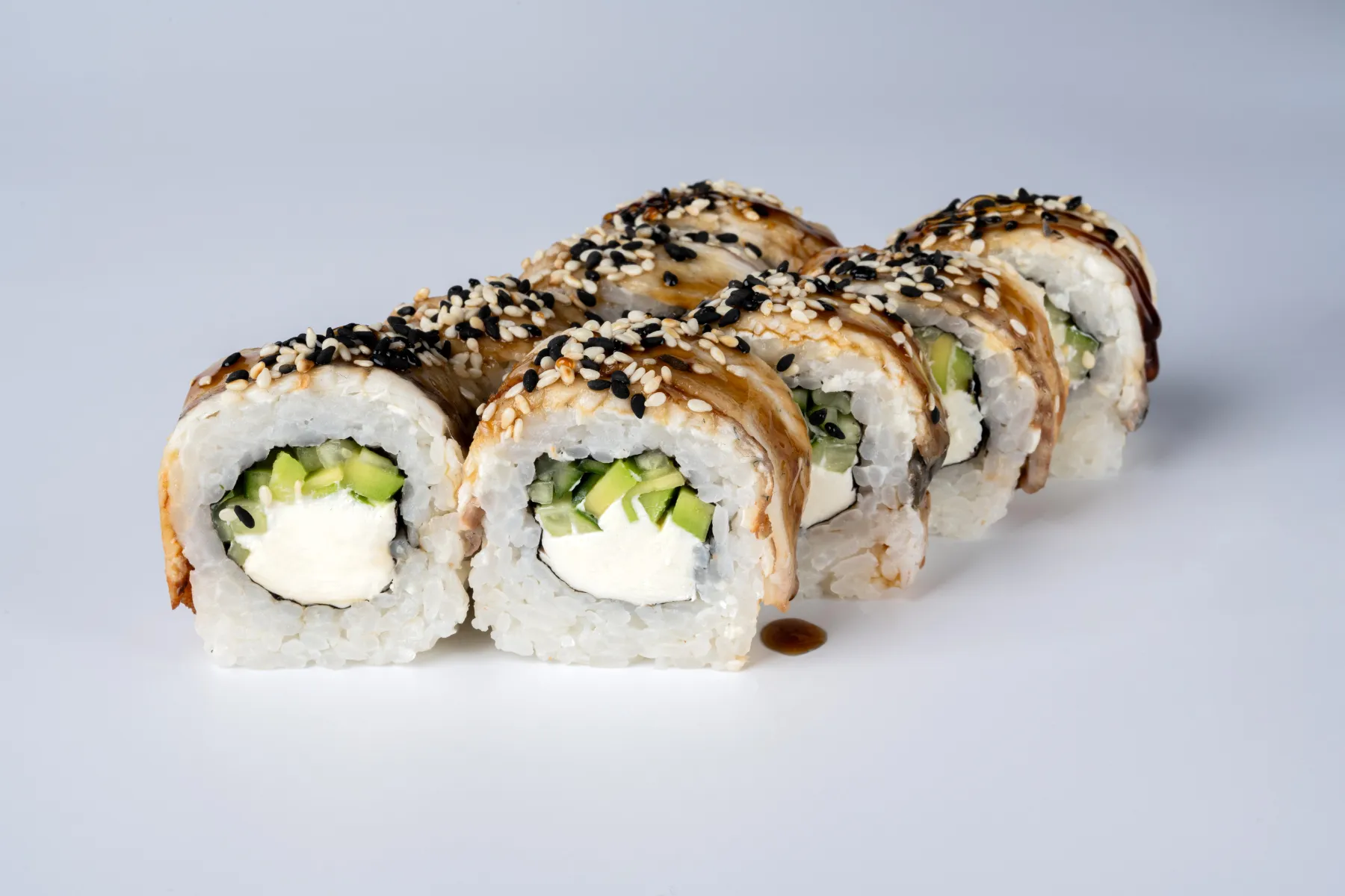 Суші рис, норі, огірок, вугор, сир вершковий “Філадельфія”.