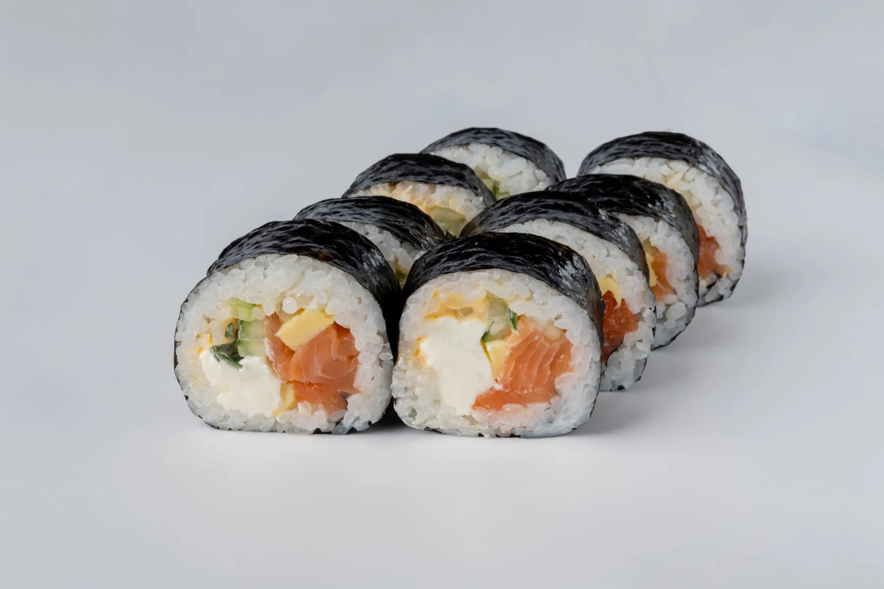Суші рис, норі, огірок, сир вершковий “Філадельфія”, свіжий лосось, солодкий омлет тамаго, гострий японський спайсі-майонез.