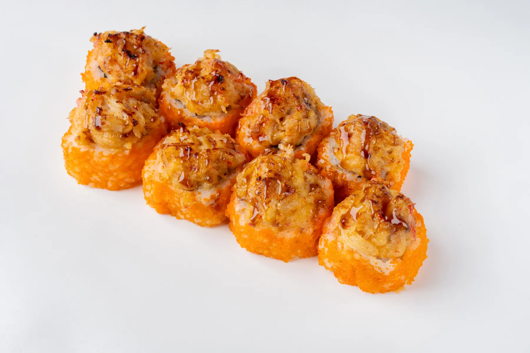 Суші рис, норі, омлет тамаго, смажений окунь, сир вершковий “Філадельфія”, сир твердий, крабове м`ясо, спайсі майонез, ікра тобіко. (300 г)