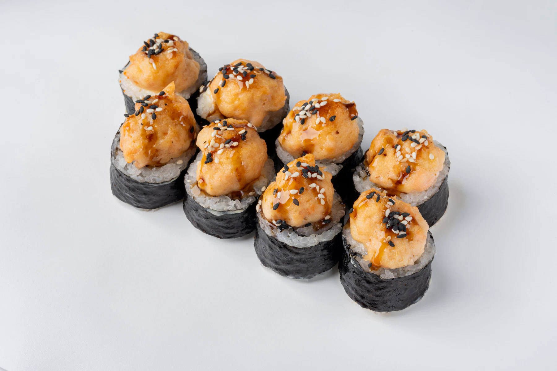 Суші рис, норі, солодкий омлет тамаго, сир вершковий “Філадельфія”, сир твердий, тунець, які соус. Прикрашений соусом унагі та кунжутним насінням.(300 г)