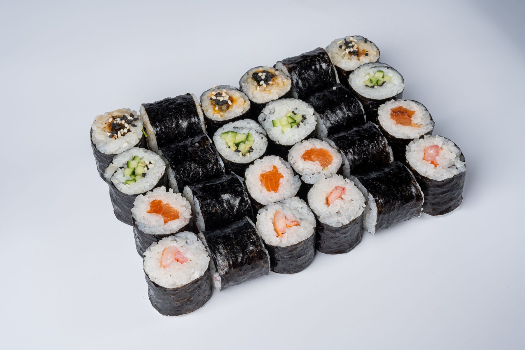Макі з лососем, Макі с мідією та соусом спайсі, Макі з огірком, Макі з креветкою. Комплект:
