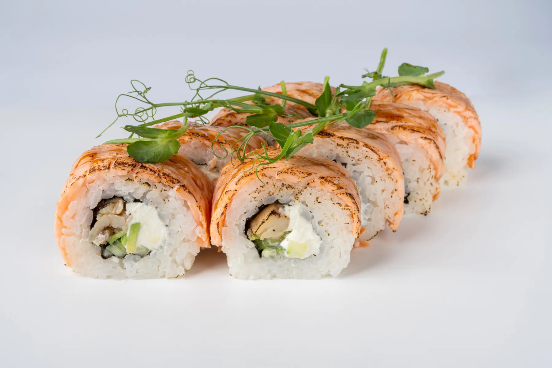 Суші рис, норі, огірок, обпалений лосось, сир вершковий, морський окунь смажений, авокадо.